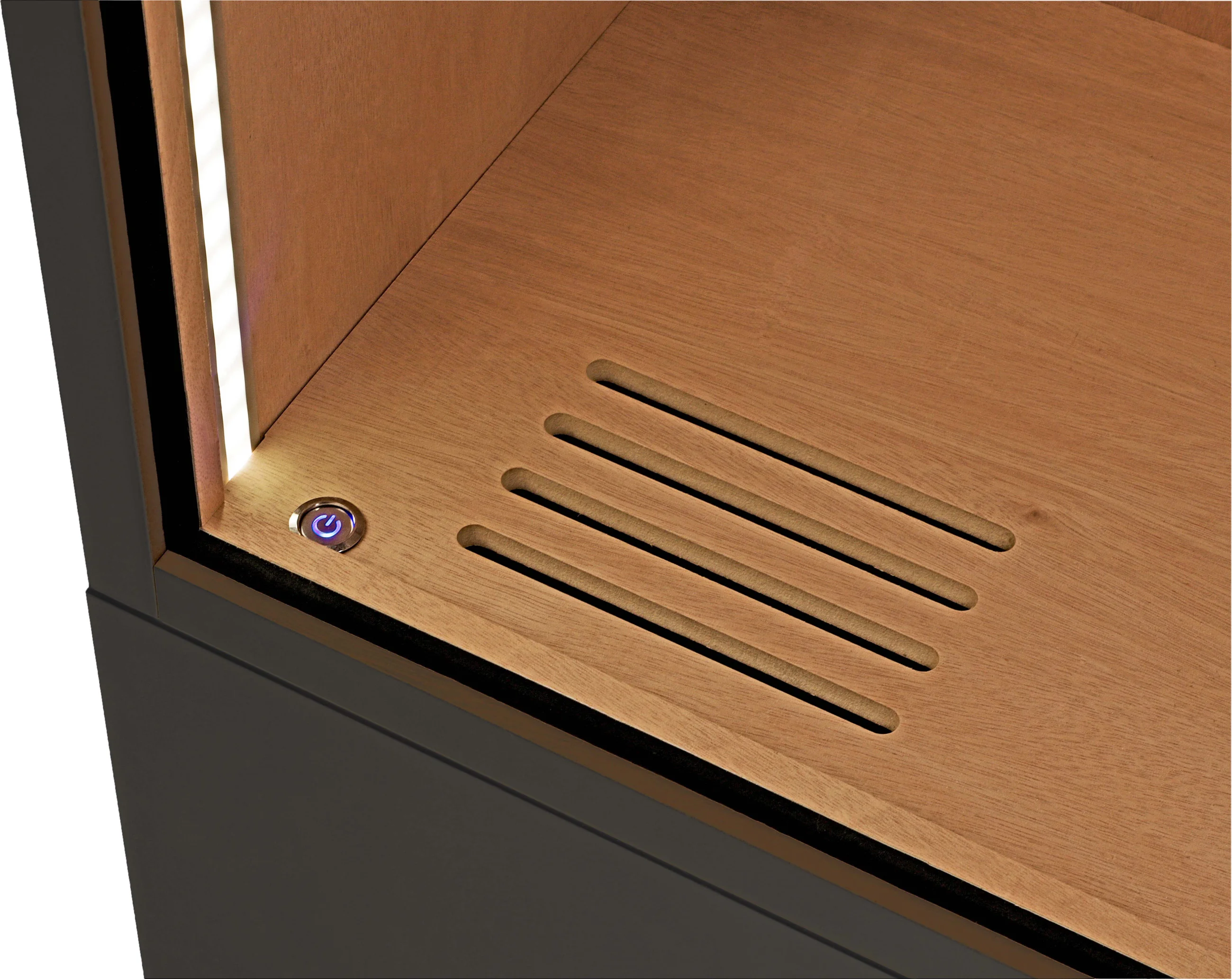 - Perfecte microprocessorgestuurde bevochtiging en ideale circulatie gegarandeerd door de dubbele achterwand. De luchtvochtigheid wordt gelijkmatig verdeeld over de verschillende verdiepingen van de humidor.