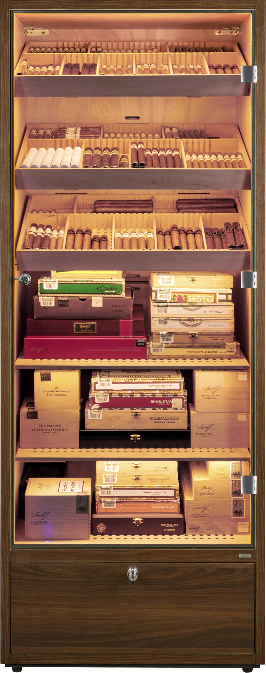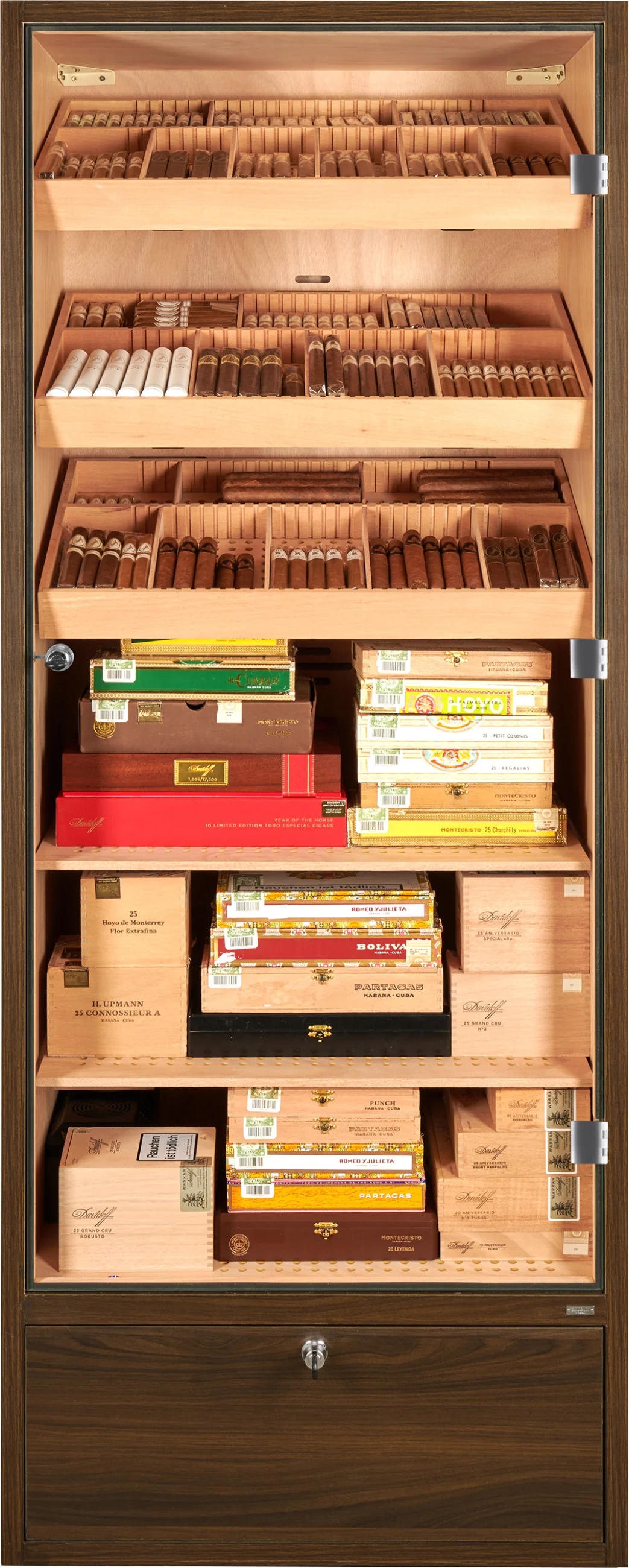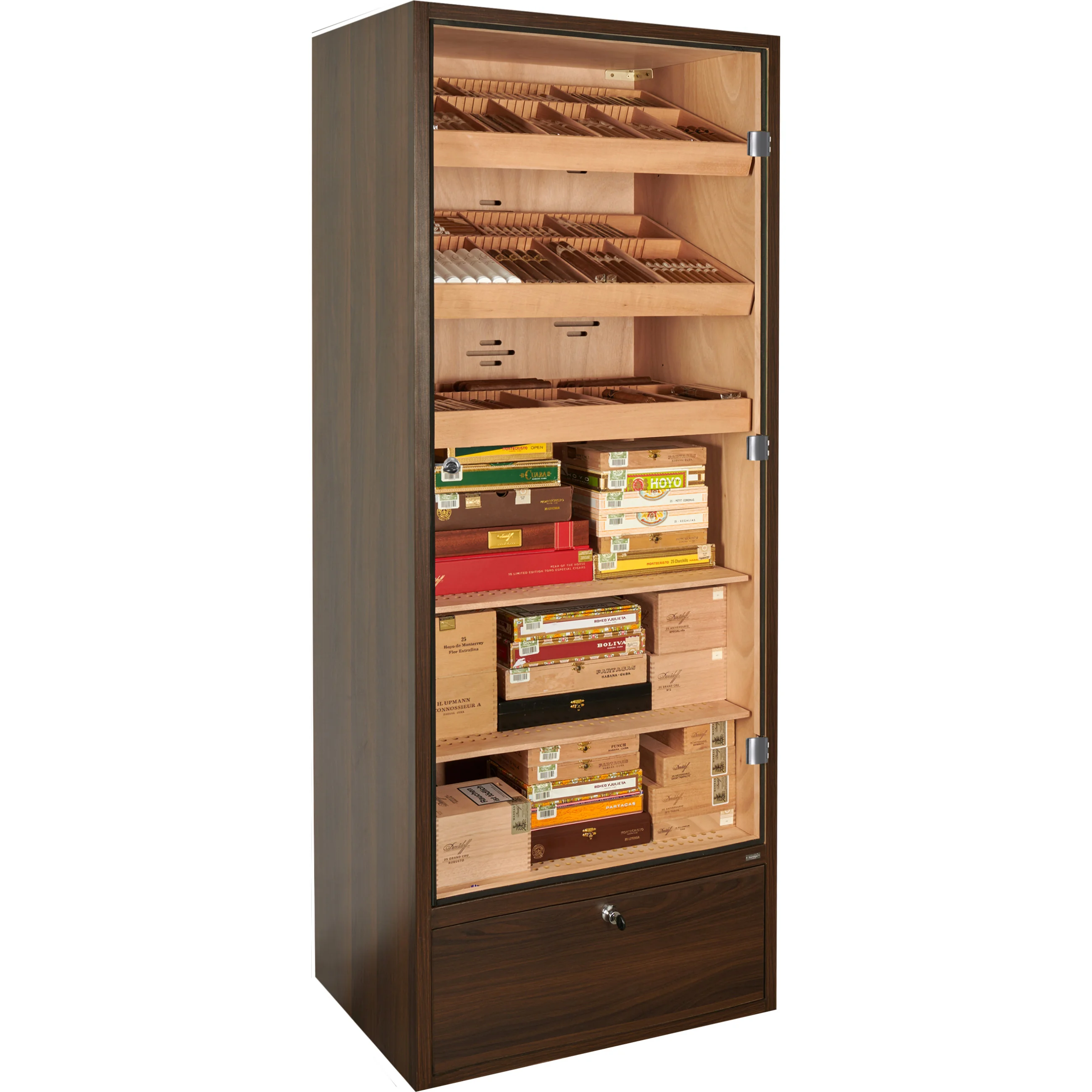 De bodem van de humidorkast bevat een afsluitbare lade die gebruikt kan worden voor het opbergen van sigaren, accessoires of verbruiksartikelen zoals gedestilleerd water. De bodem van de lade is geperforeerd en gescheiden van de binnenkant, waardoor de luchtvochtigheid kan circuleren en de sigaren veilig kunnen worden bewaard.