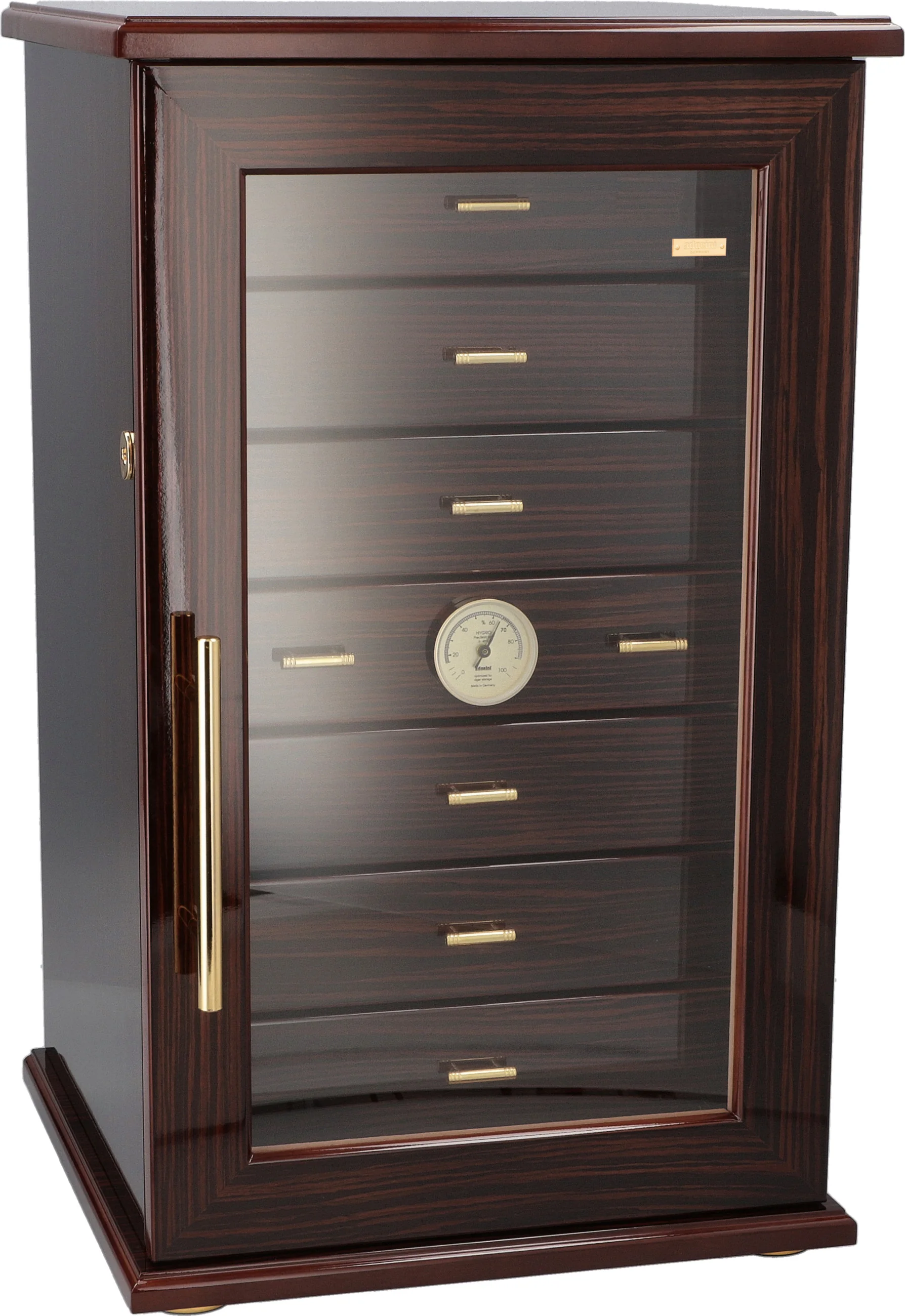 De prachtige humidor in kaststijl springt in het oog met een meervoudig gelakte hoogglans ebbenhouten afwerking en een glazen deur met een soepel maar toch goed afdichtend magnetisch sluitmechanisme dat het openen en sluiten van de deur tot een vreugdevolle gebeurtenis maakt. In de humidor zorgen zeven uittrekbare lades voor een grotere flexibiliteit bij het organiseren van uw sigarencollectie, wat verder wordt geholpen door het innovatieve verdelingssysteem van adorini en de verdelingslabel clips. Dit maakt het scheiden van meer dan 30 Corona-formaat sigaren per lade efficiënter. Het zorgt er ook voor dat het kiezen van die volgende heerlijke sigaar gemakkelijker is, waardoor je meer tijd hebt om te ontspannen en te genieten van het moment.
