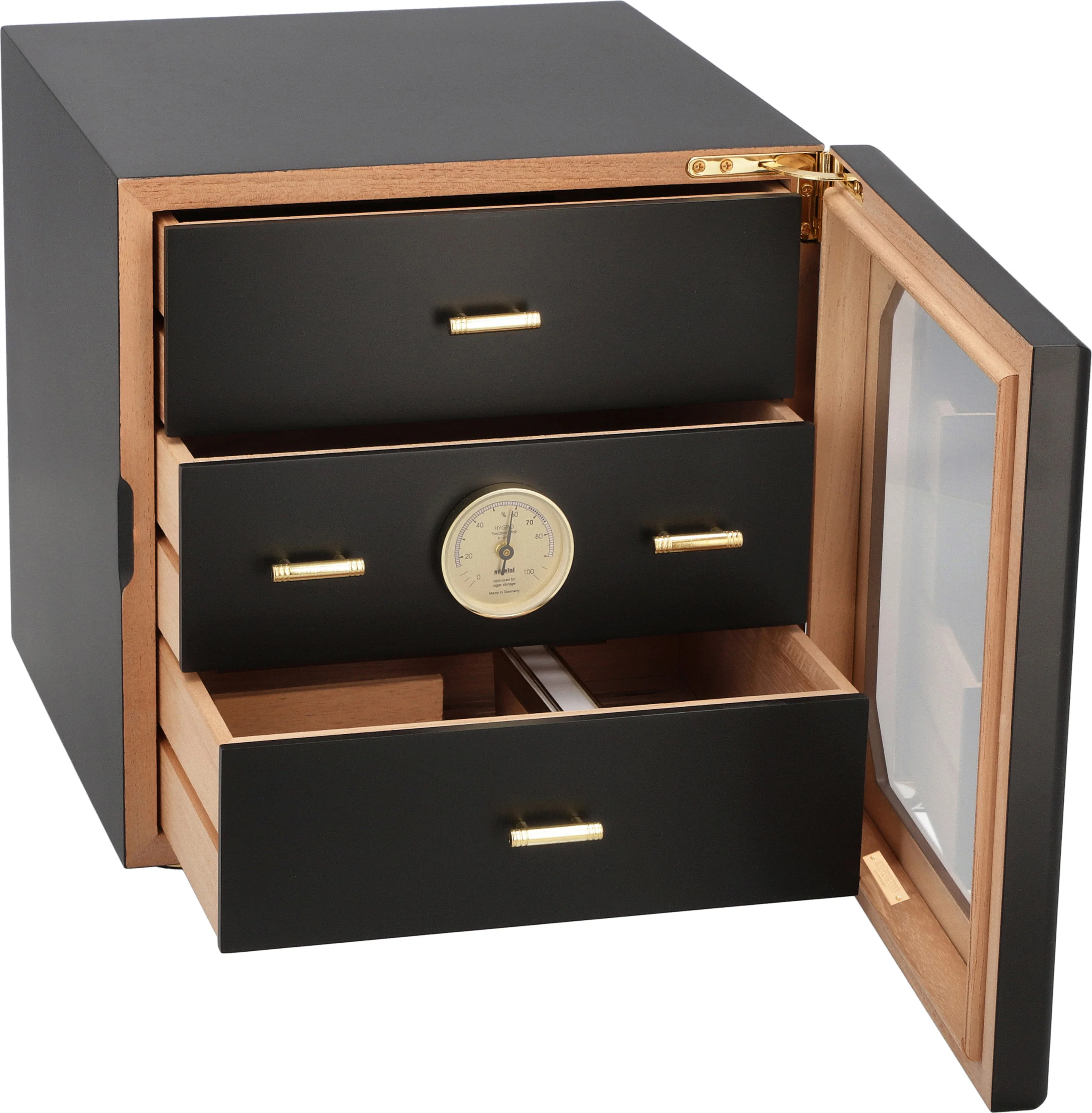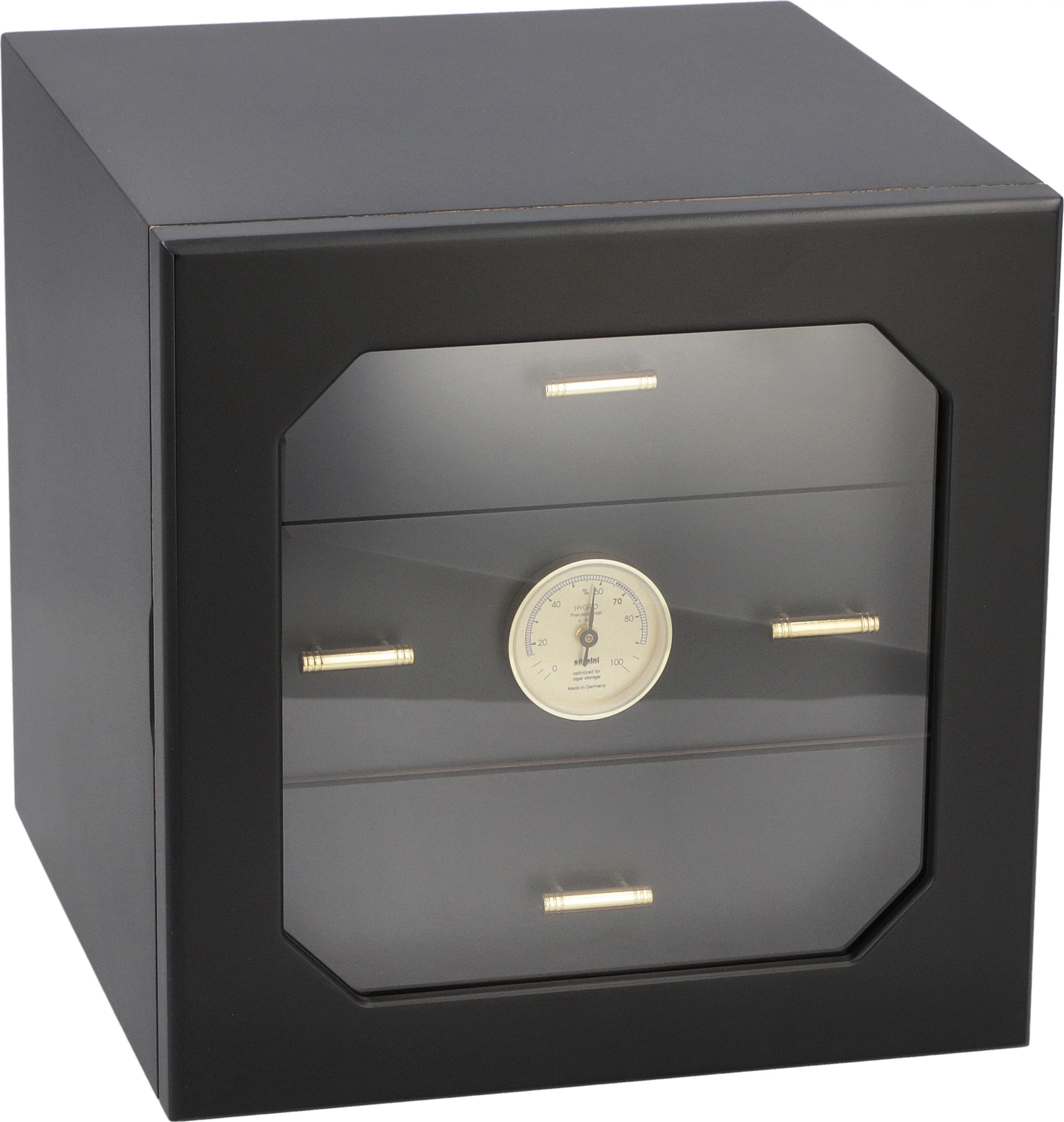 Deze razend populaire humidor voegt een elegante symmetrie toe aan de sigarenopslag met een stijlvol maar functioneel kubusvormig ontwerp. Een meervoudig gelakte matte afwerking verbindt vergulde accenten en een glazen kijkvenster ingebouwd in de deur om de humidor een efficiënte en aangename toevoeging aan elk interieur te maken. Meer dan 125 sigaren van Corona-formaat kunnen veilig worden weggestopt in de drie schuifladen van gestoomde Spaanse ceder van de humidor met adorini´s exclusieve RibTech ventilatieribben voor verbeterde luchtstroom.