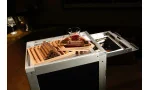 Het interieur van de trolley is bekleed met hoogwaardig okume hout, dat wordt gekenmerkt door zijn vochtbestendige eigenschappen - ideaal voor het opbergen van sigaren. Twee niveaus bieden flexibele opbergruimte voor dozen of losse sigaren, terwijl een aparte aluminium lade in het onderste gedeelte ruimte biedt voor accessoires of flessen.