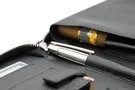 Het interieur van de tas is efficiënt ontworpen met ruimte voor een verscheidenheid aan accessoires, waaronder een sigarenknipper, aansteker, pen of potlood, en zelfs pasjes, zoals identificatie of een creditcard. Een apart compartiment voor sigaren biedt plaats aan een breed spectrum van verschillende sigarenformaten, waardoor tot 5-7 Churchill-formaat sigaren veilig worden bewaard. Deze sigaren worden op hun plaats gehouden door een leren flap die meerdere magnetische sluitingen heeft, voor een nauwkeuriger aanpassingsvermogen aan de lengte van de sigaren.