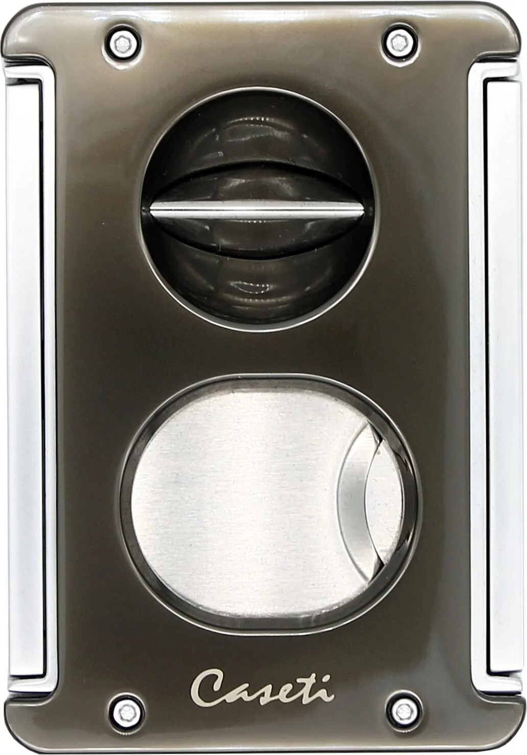 Verhoog uw sigarenervaring met de Caseti 3-in-1 sigarenknipper in matgrijs met zilveren accenten. Dit praktische accessoire komt tegemoet aan de voorkeuren van verschillende sigarenliefhebbers en combineert naadloos een klassieke snede, een v-snede en een sigaren punch in één instrument.