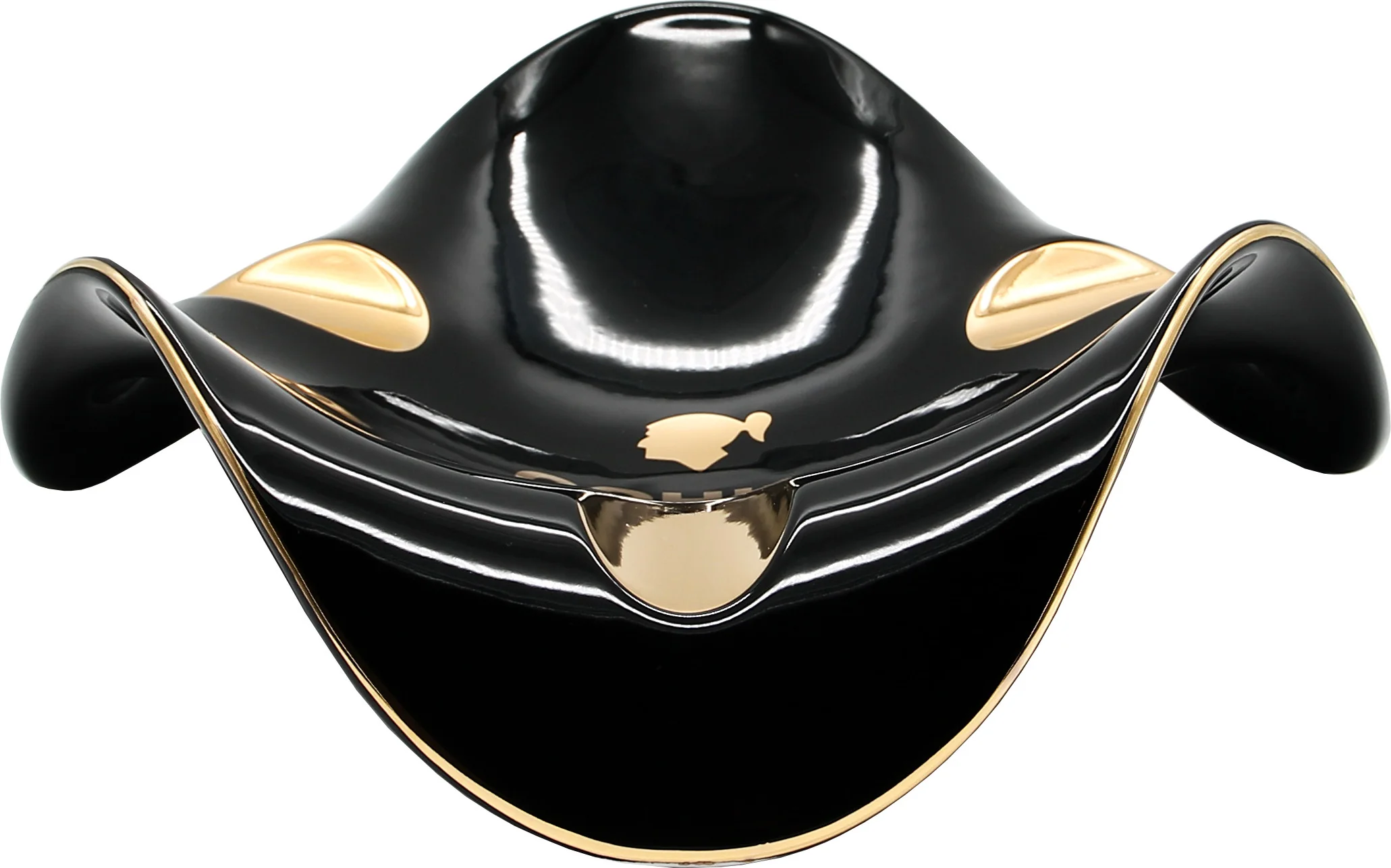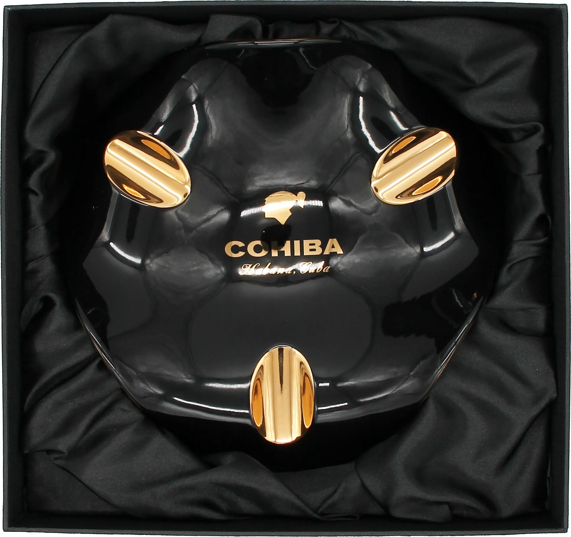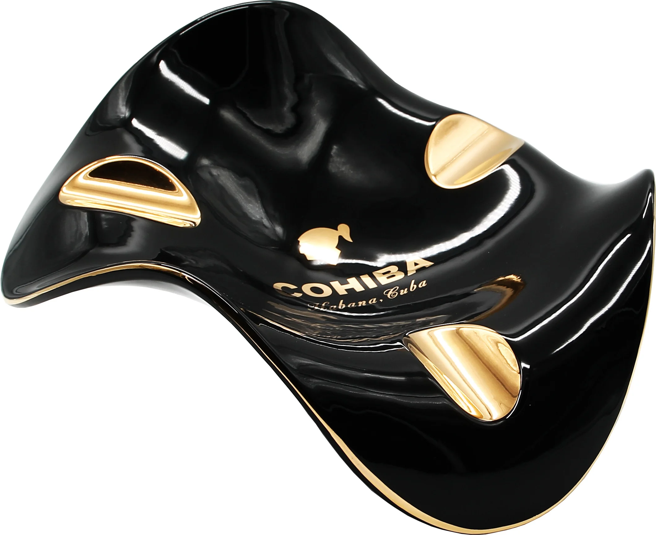 De Cohiba asbak in zwart met gouden accenten is een uitzonderlijk accessoire van het meest bekende Cubaanse sigarenmerk, Cohiba. Het gebogen ontwerp geeft het een speciale elegantie, waardoor het een echte blikvanger is in elke omgeving. Drie royale sigarensteunen bieden voldoende ruimte om in gezelschap van sigaren te genieten en combineren functionaliteit met esthetische aantrekkingskracht.