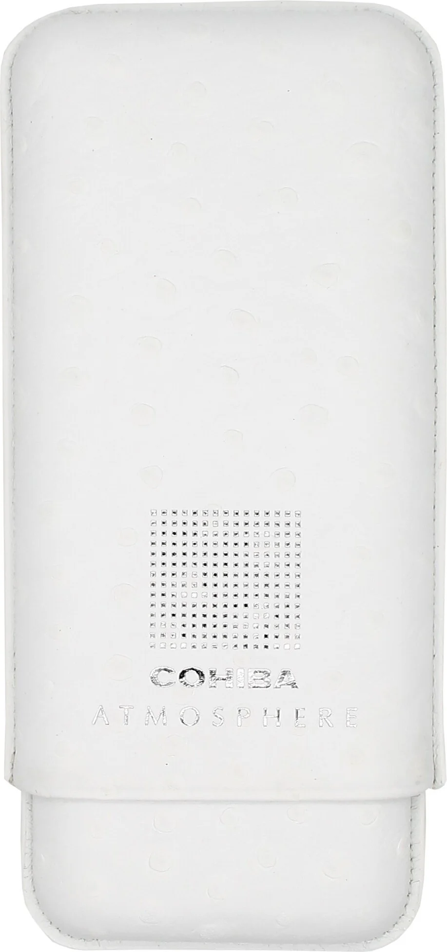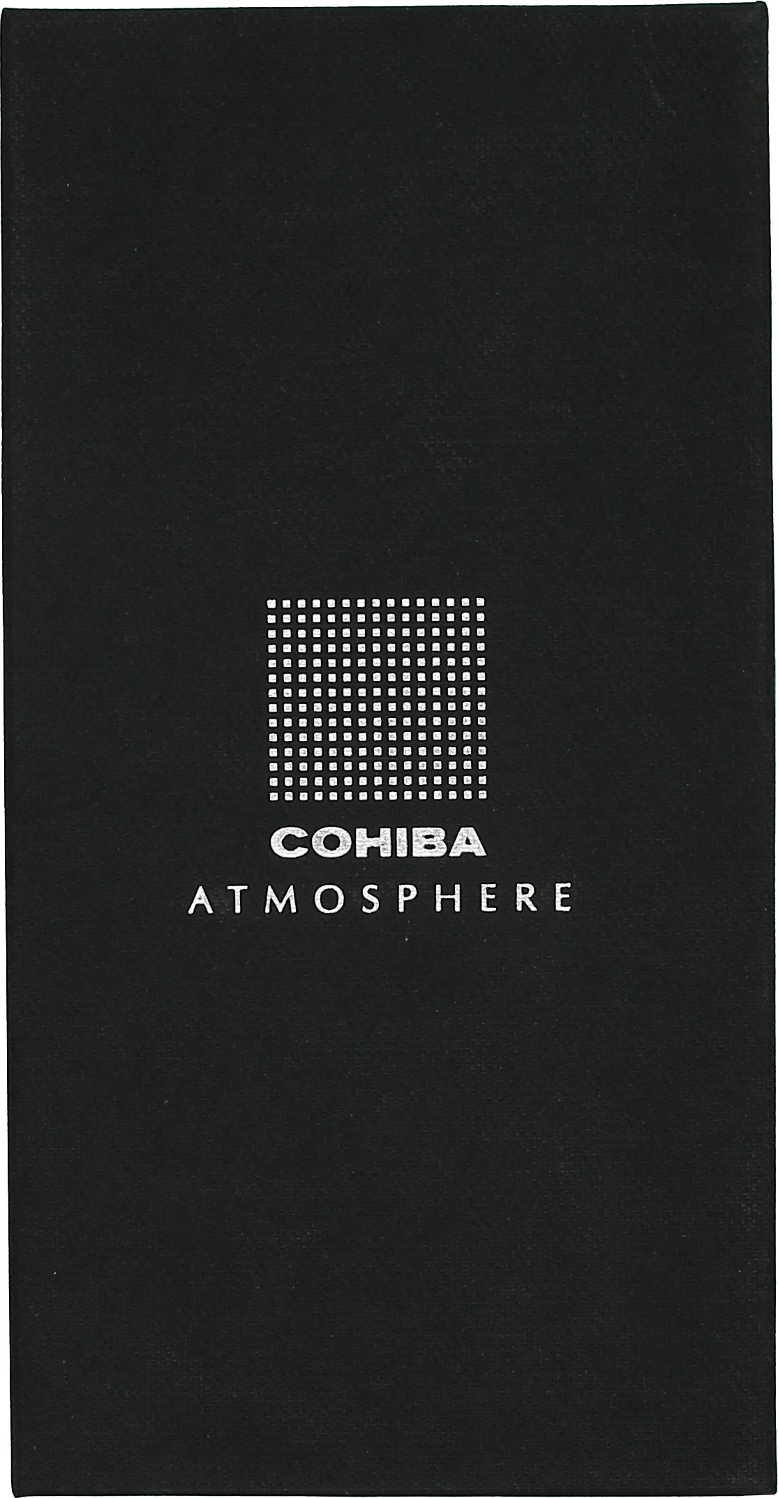 Op de voorkant zorgt de elegante zilveren Cohiba Atmosphere logo-opdruk voor onmiddellijke herkenning en geeft de etui een uitstraling van luxe en authenticiteit.
