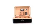 Met een capaciteit van ongeveer 100-125 sigaren biedt de humidor genoeg ruimte voor uw verzameling. Binnenin zorgen twee flexibel in te voegen of uitneembare verticale verdelers voor optimale organisatie. De meegeleverde digitale hygrometer maakt een nauwkeurige meting van de luchtvochtigheid mogelijk, met de benodigde knoopcelbatterij al inbegrepen. Bevochtiging wordt geleverd door een passieve luchtbevochtiger, die stijlvol aan het deksel is bevestigd in een magnetische houten houder. De zilveren soft-close scharnieren ronden het hoogwaardige uiterlijk perfect af.
