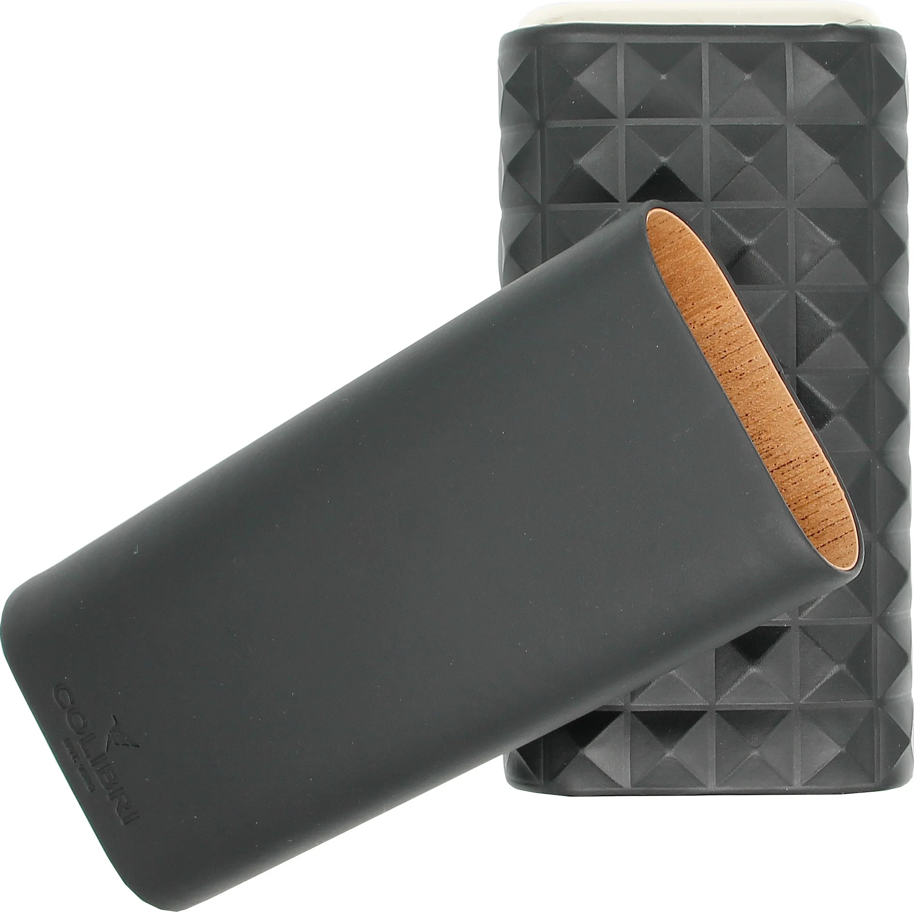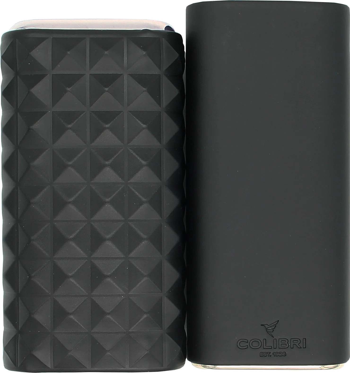 De koker heeft een tweedelig, uitschuifbaar schuifmechanisme in elegant zwart. De verchroomde boven- en onderkant geven de sigarenkoker een opvallend karakter. De voorkant van het onderste gedeelte is voorzien van een subtiel reliëf van het Colibri logo, wat het hoogwaardige uiterlijk perfect aanvult.