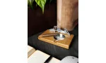 - De plek voor de schaar in de houten basis maakt het mogelijk om de schaar flexibel of permanent vast te houden. Er wordt een spijker meegeleverd om de schaar indien nodig permanent in de houder te bevestigen - ideaal voor gebruik in restaurants of sigarenlounges.