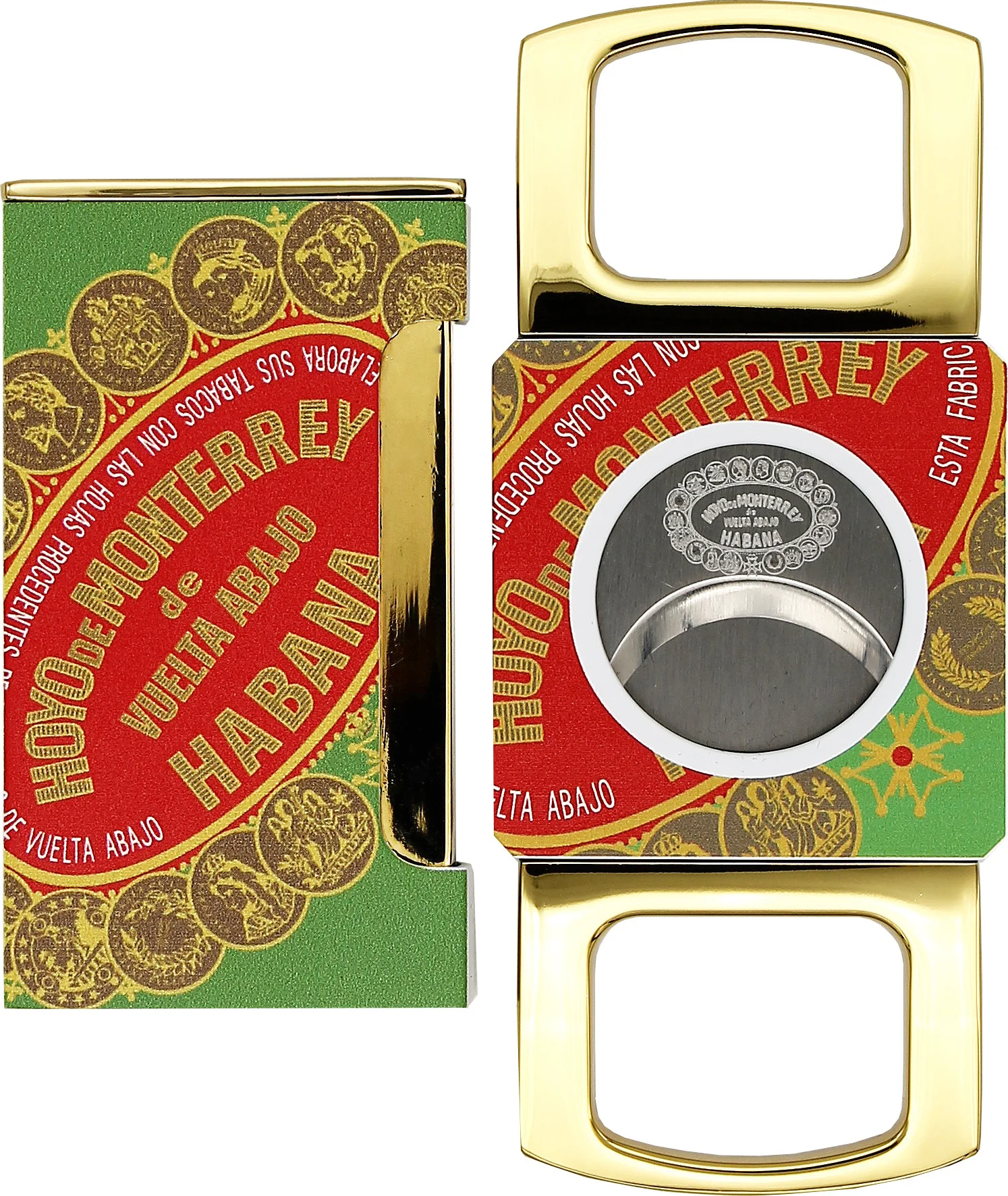 De groene en rode Hoyo de Monterrey motieven worden aangevuld met glanzende gouden accenten, waardoor zowel de aansteker als de cutter een exclusieve uitstraling hebben. Het samenspel van de merkkleuren, goud en hoogwaardig vakmanschap maakt deze set een elegante en moderne metgezel voor elke sigarenliefhebber.
