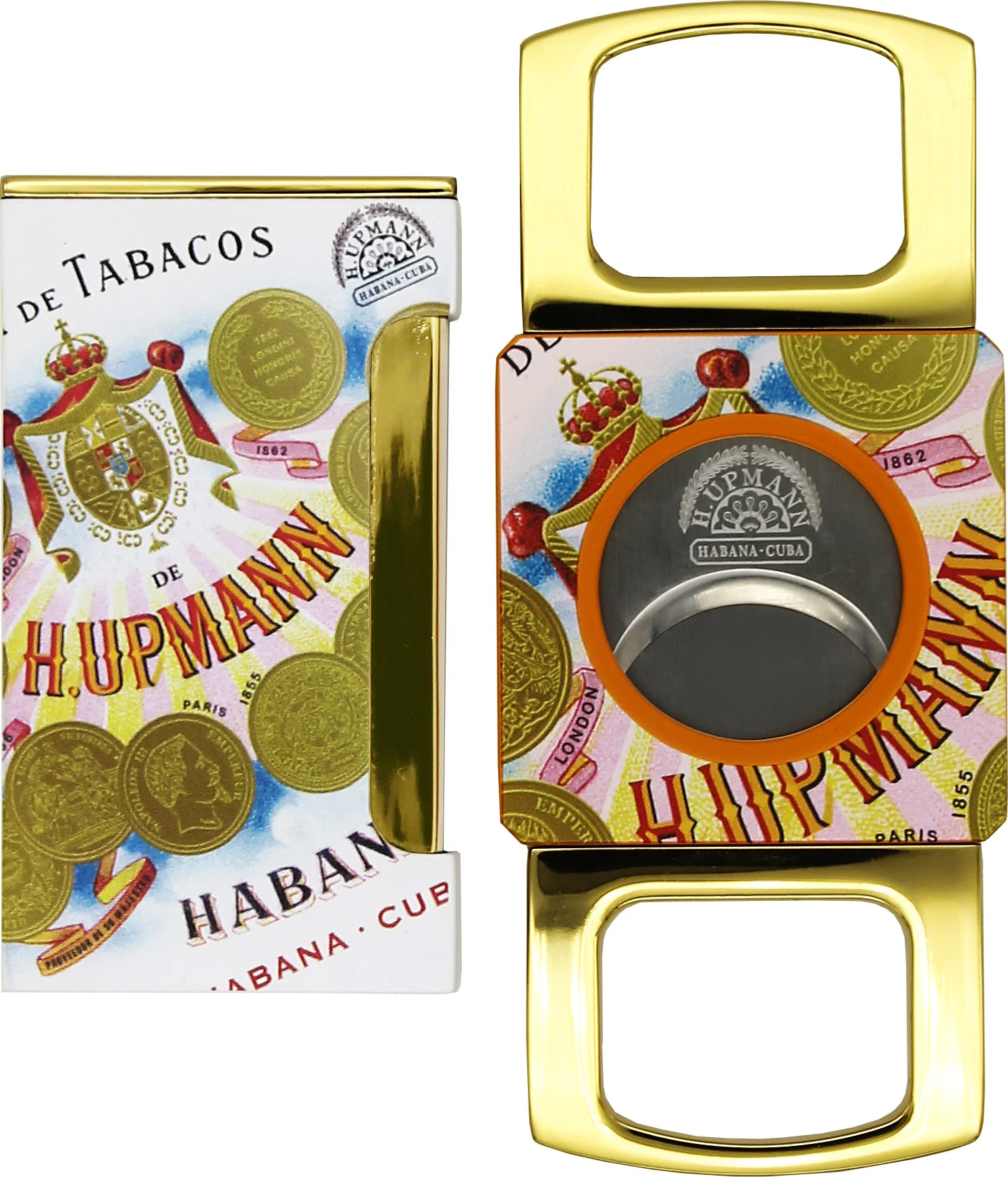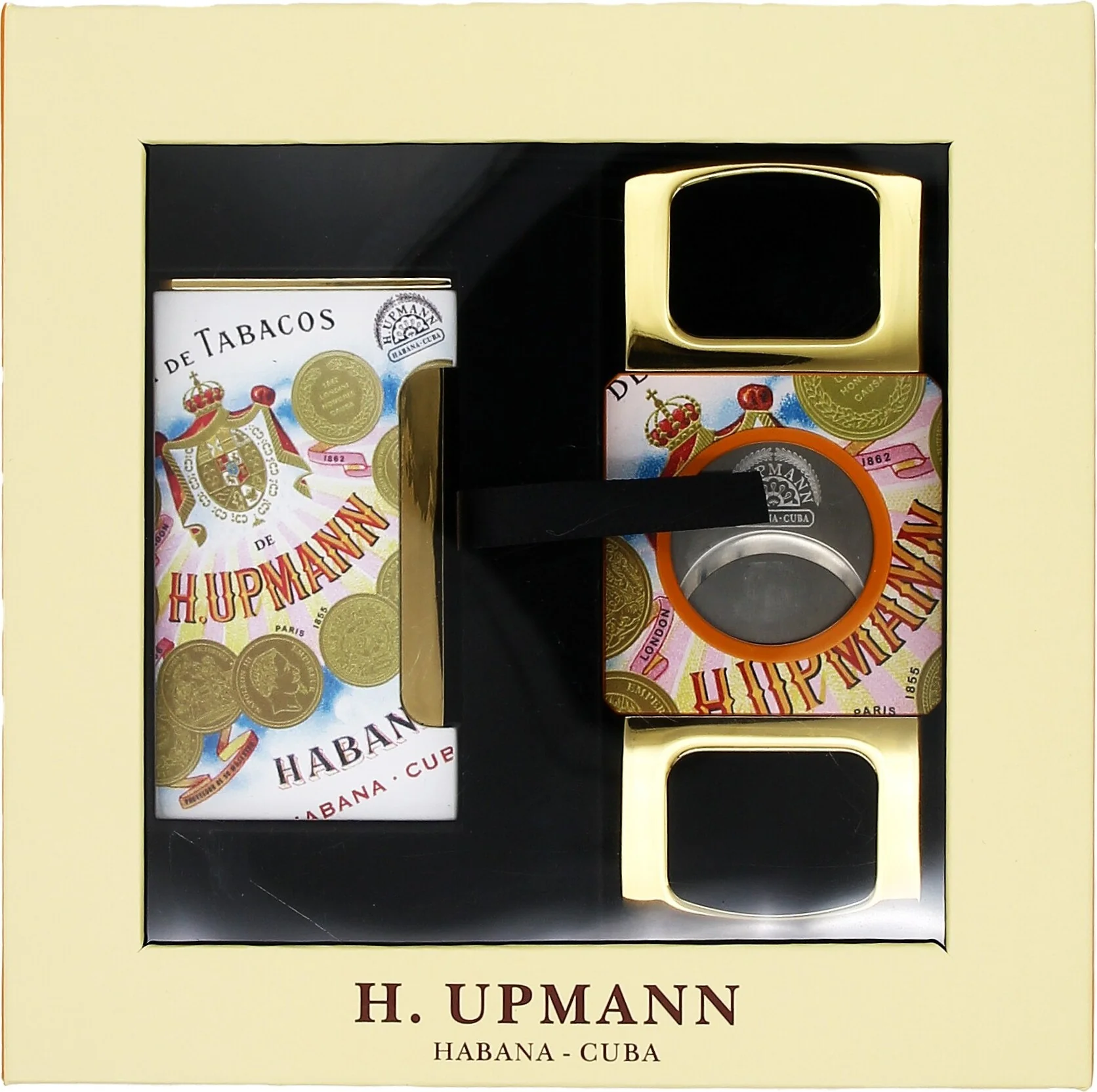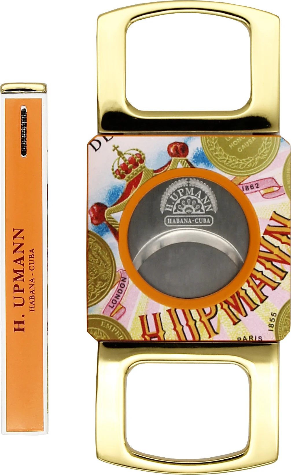 Deze H. Upmann aansteker en sigarenknipperset combineert twee accessoires van hoge kwaliteit van het lang gevestigde Cubaanse sigarenmerk H. Upmann. Beide onderdelen van de set zijn voorzien van de kenmerkende H. Upmann medaillonmotieven en het merklogo in oranje tinten aan beide zijden, waardoor een onderscheidende en iconische look ontstaat.