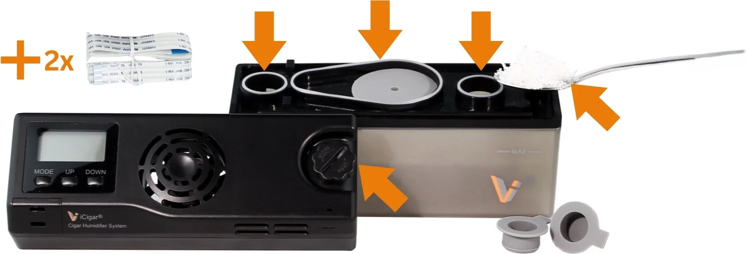 De LV onderhoudskit is het ideale accessoire om de vlekkeloze werking en lange levensduur van uw LV elektronische luchtbevochtiger te garanderen. Het bevat alle essentiële vervangings- en slijtageonderdelen die tijdens het gebruik regelmatig vervangen moeten worden om een constant optimale luchtvochtigheid in uw humidor te handhaven.