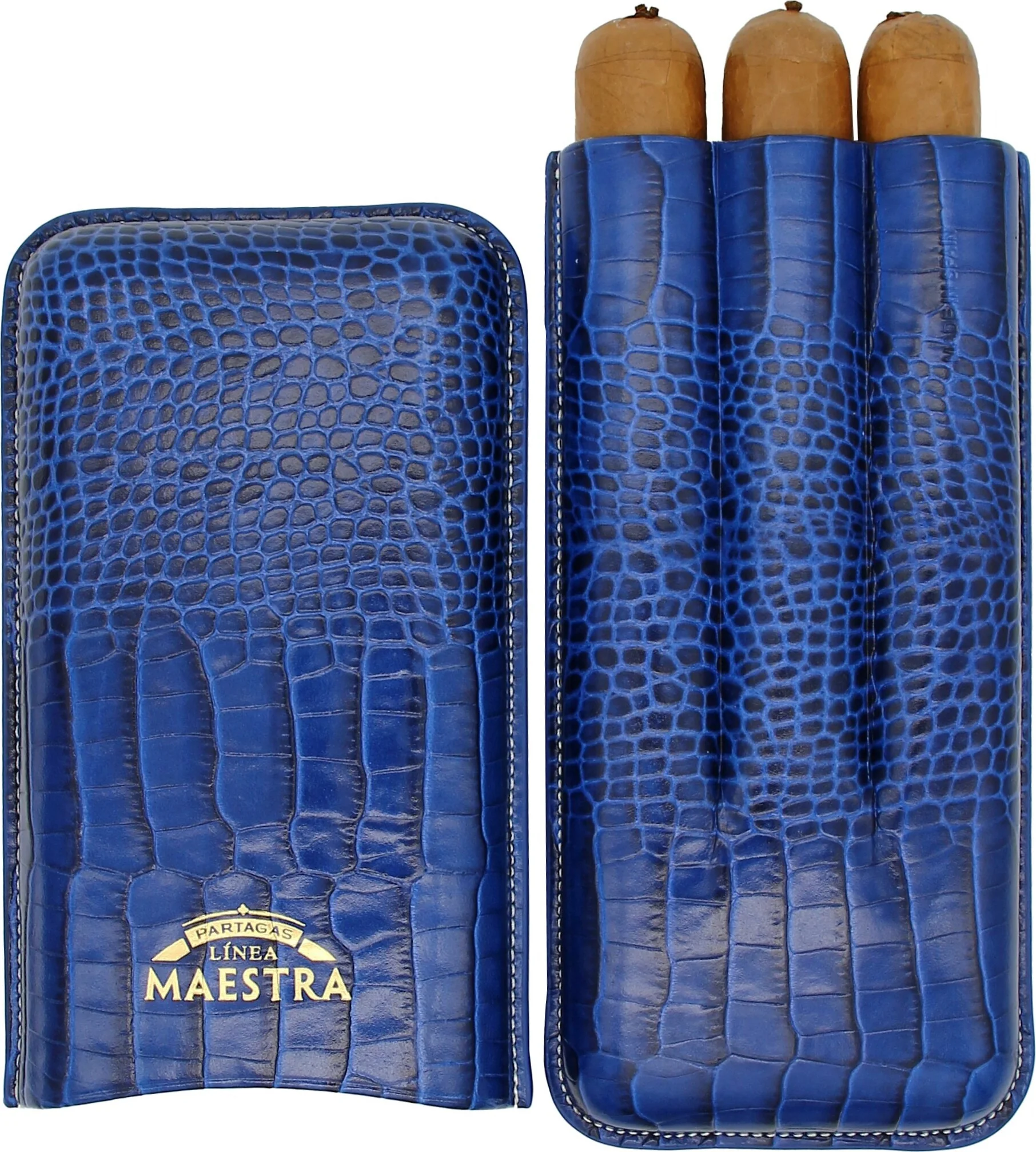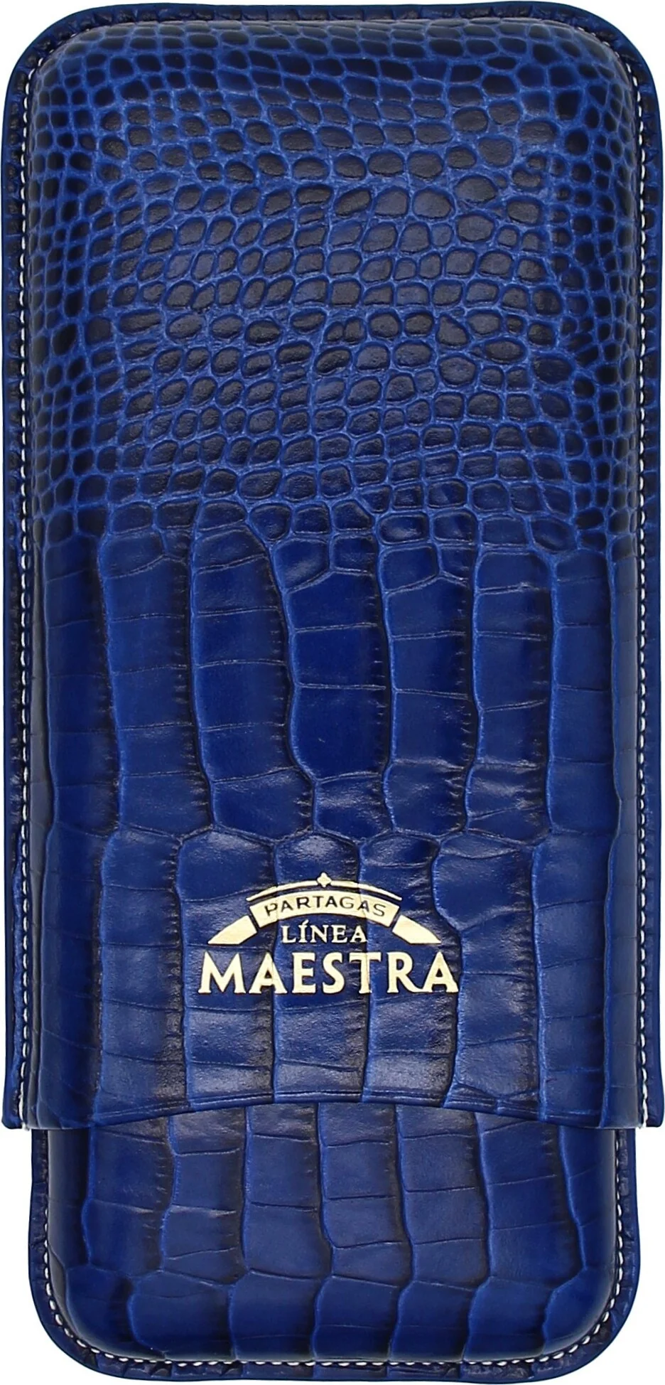 De Partagas Linea Maestra echt lederen sigarenkoker in opvallend blauw is een luxe accessoire van het Cubaanse sigarenmerk Partagas, specifiek uit hun premium Linea Maestra lijn. Het oppervlak van fijn reliëfleer met een krokodillenpatroon in reliëf zorgt voor een authentieke uitstraling. Het merklogo, dat onmiskenbaar Partagas vertegenwoordigt, staat prominent op de voorkant, wat de etui een exclusieve uitstraling geeft.