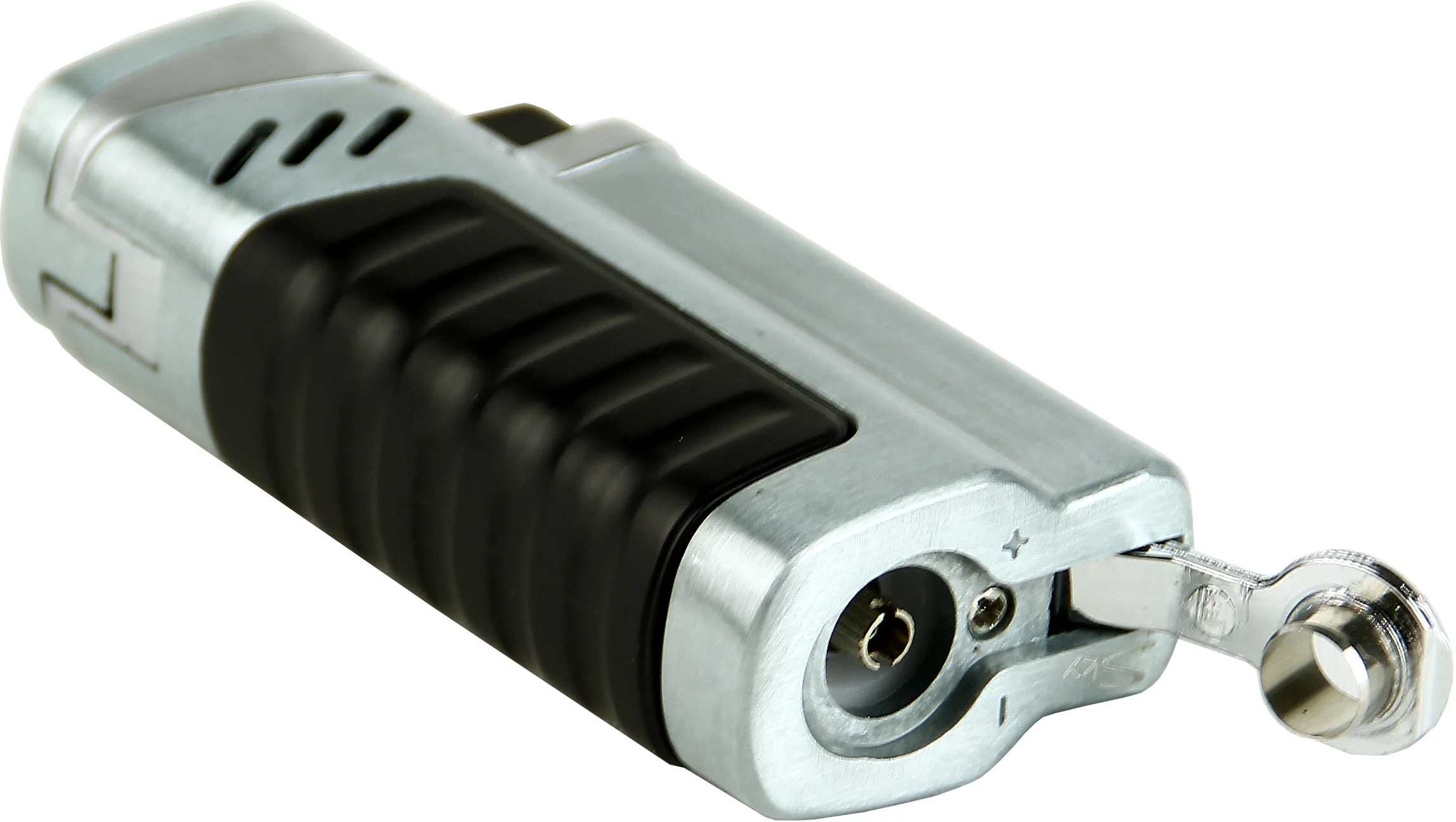 - **Gestroomlijnd chromen ontwerp:** De aansteker heeft een stijlvolle chromen behuizing met zwarte greepelementen, die esthetiek met functionaliteit combineren.