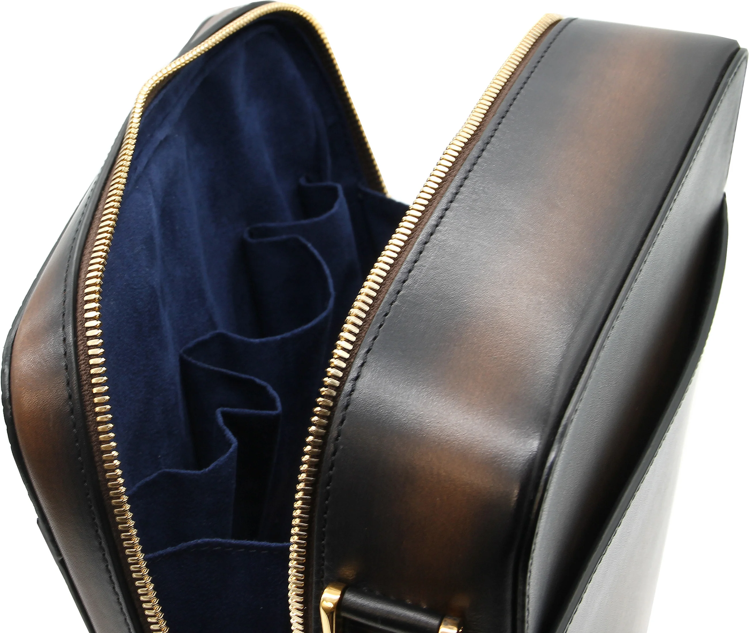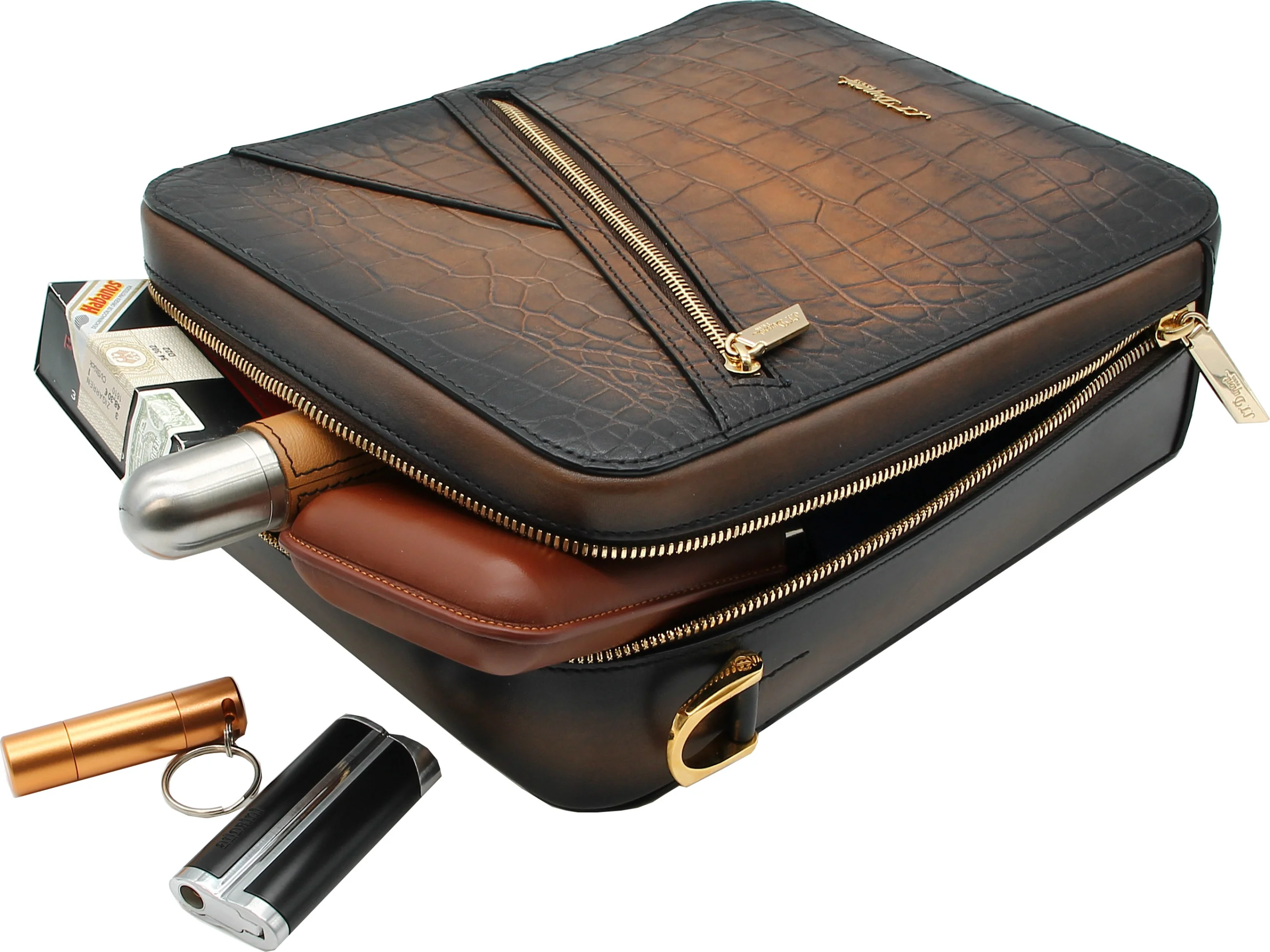 Binnenin de tas zijn er aparte vakken voor sigarenaccessoires zoals aanstekers en knippers, en speciale vakken voor creditcards. Deze verdeling zorgt ervoor dat alle belangrijke gebruiksvoorwerpen veilig en overzichtelijk worden opgeborgen. Met afmetingen van 25 x 20,5 x 7,5 cm biedt de tas genoeg ruimte voor uw persoonlijke spullen en sigarenaccessoires.