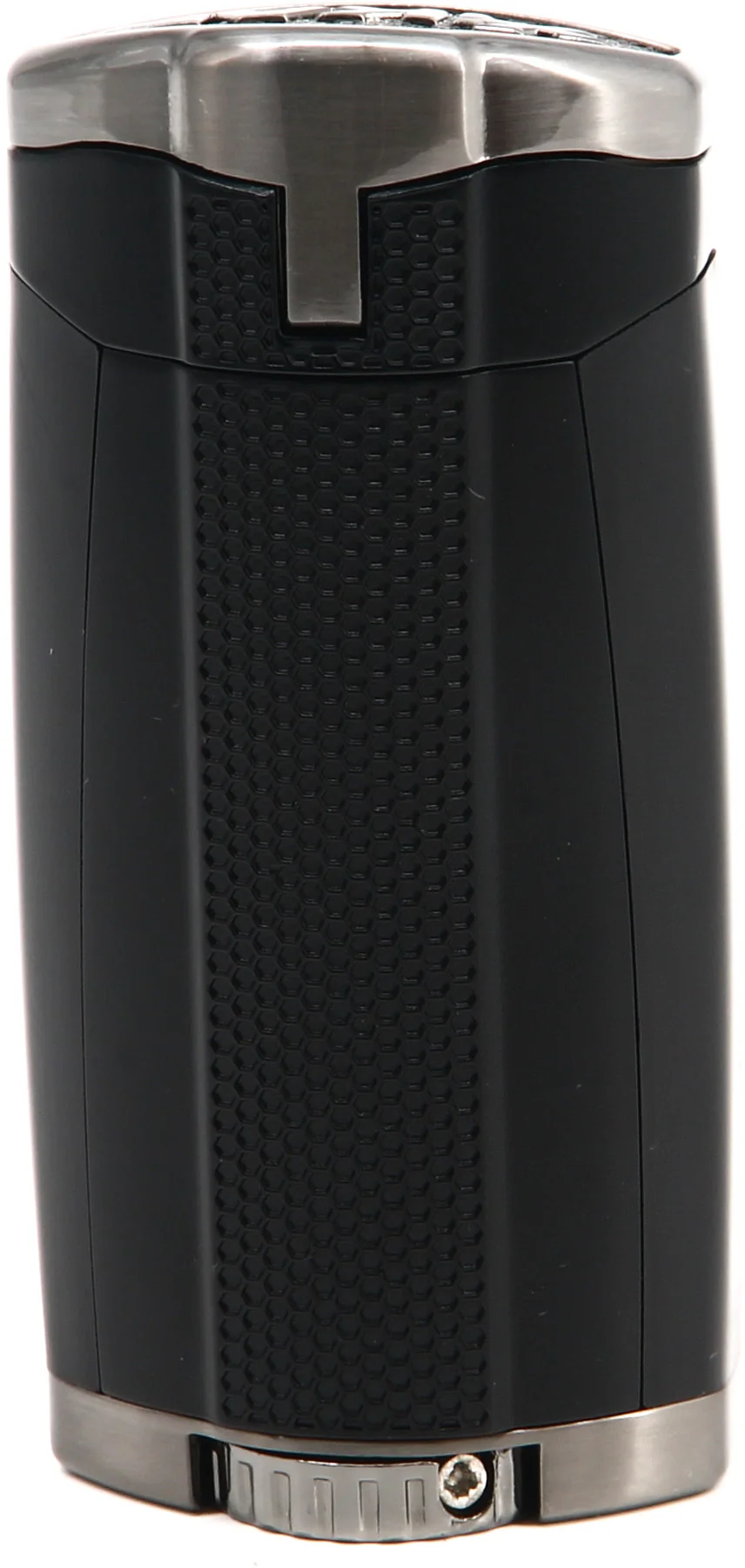 Het beschermende deksel en de naar beneden schuivende ontstekingstrekker hebben een honingraatvormige textuur die ook voor een betere grip zorgt als een vleugje zwier. De krachtige inline drievoudige jet-vlammen van de HP3 bieden ongeëvenaarde controle en dekking, waardoor u sigaren efficiënter kunt aansteken, ongeacht de weersomstandigheden. De vlammen stelt u af met het extra grote stelwiel aan de onderkant van de aansteker. Een blik werpen op het brandstofpeil is nog nooit zo eenvoudig geweest met de grote brandstofpeilvensters van de HP3 die prominent aan de voorkant van de aansteker zijn geplaatst.