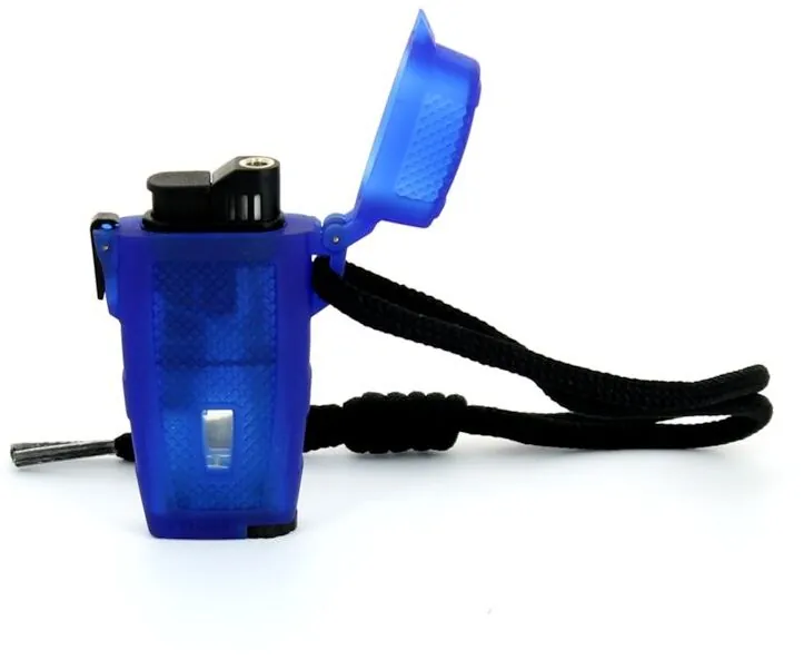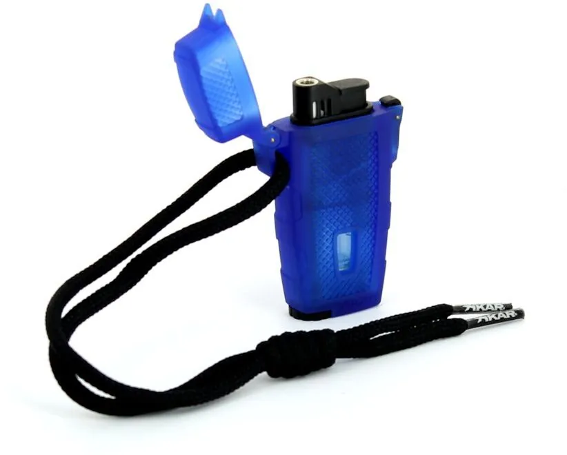 Xikar aansteker model Stratosphere in blauw. Deze storm-proof outdoor aansteker met turbo vlam bestaat uit een rubberen lichaam en heeft een goed zichtbare niveau indicatie.